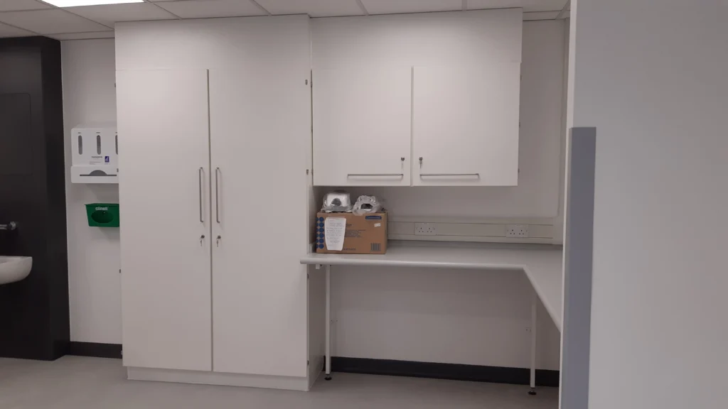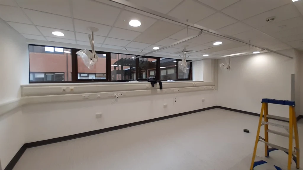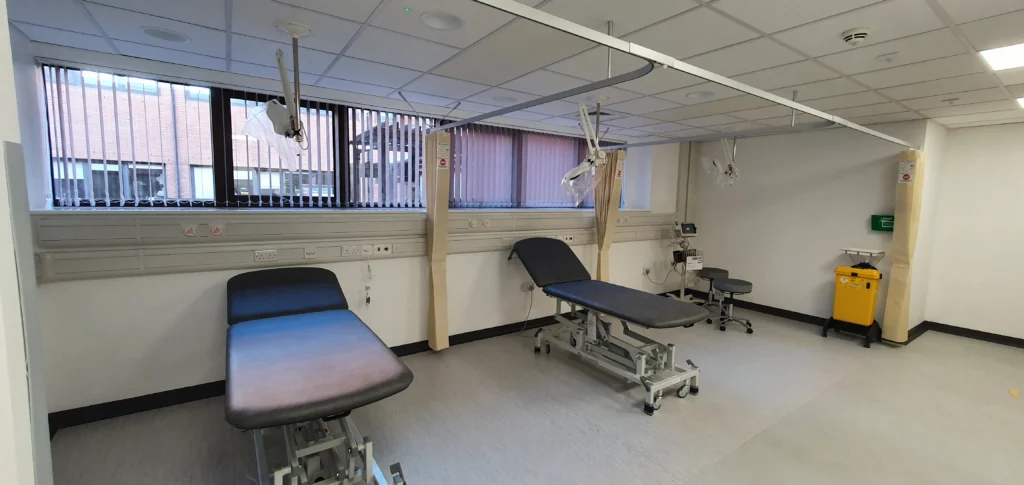 Works involved the refurbishment of two existing staff changing rooms to create a new 3-bay clinical examination room for the Emergency Surgical Advisory Centre (ESAC) at Musgrove Park Hospital, forming part of the wider Acute Assessment Hub. HTM compliant works included data, nurse call and med gases to three bays with a nurse station and admin base.